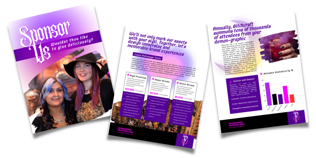 We won't just slap your sigil everywhere and call it a day. what we're seeking is an immersive partnership so as to create valuable attendee experiences that make an impact. when your brand stands with bitchcraft fair, you gain fidelity with radical makers and passionate small business owners during an age of digital disruptions and wasteful consumerism.